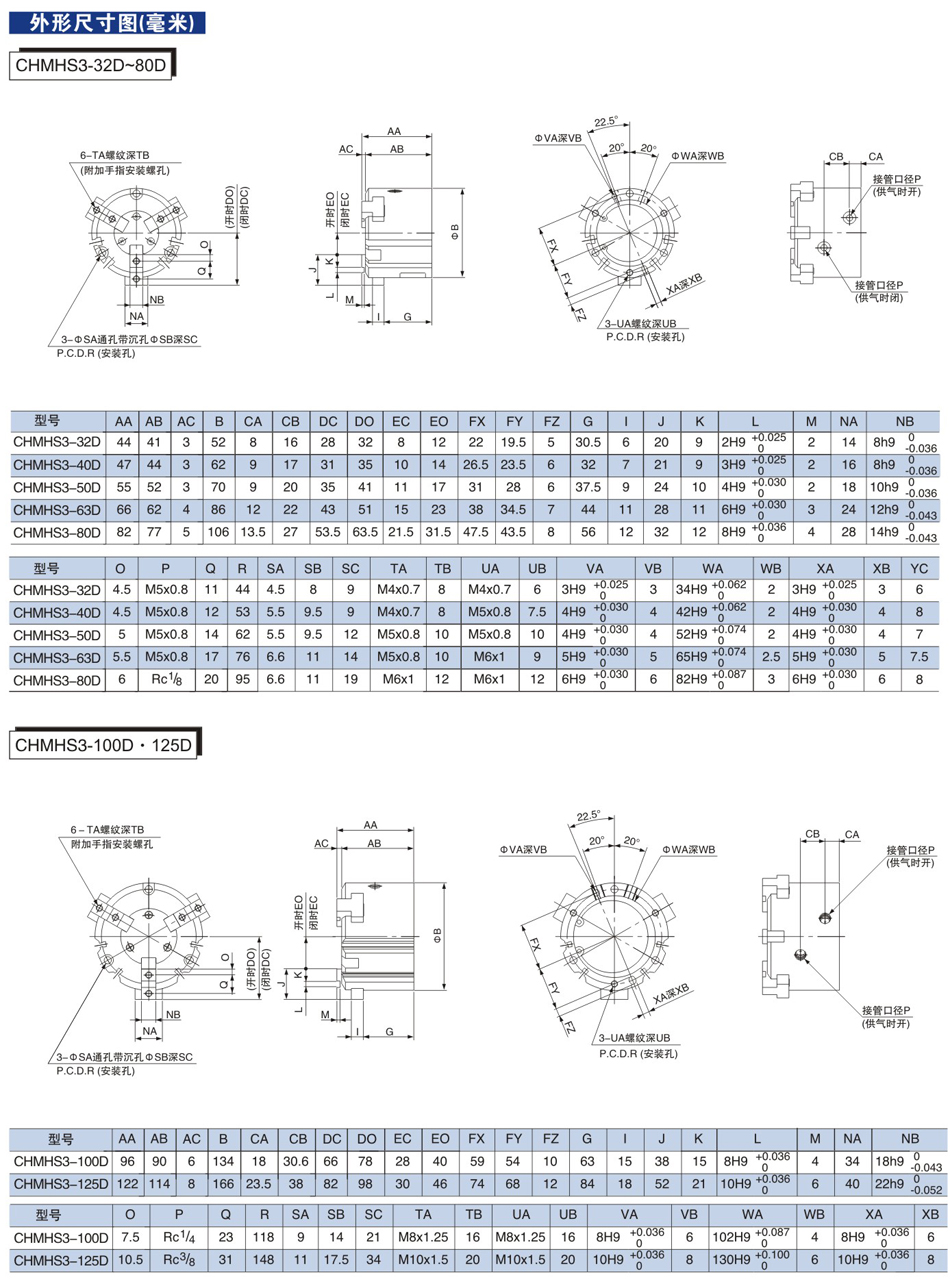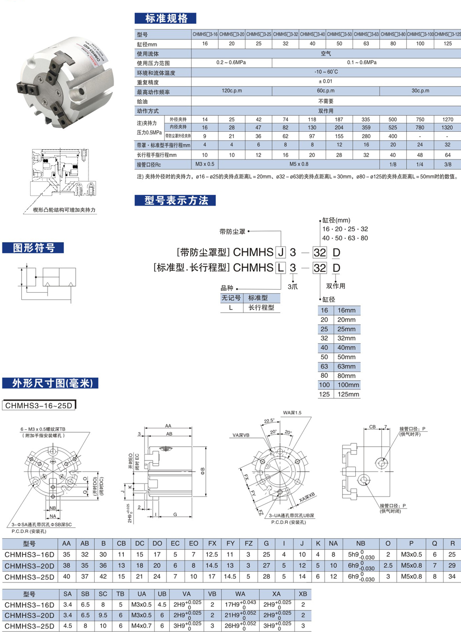 CHMHS3系列(Φ16-Φ125) 氣爪(平行開閉型)/圓柱型爪體