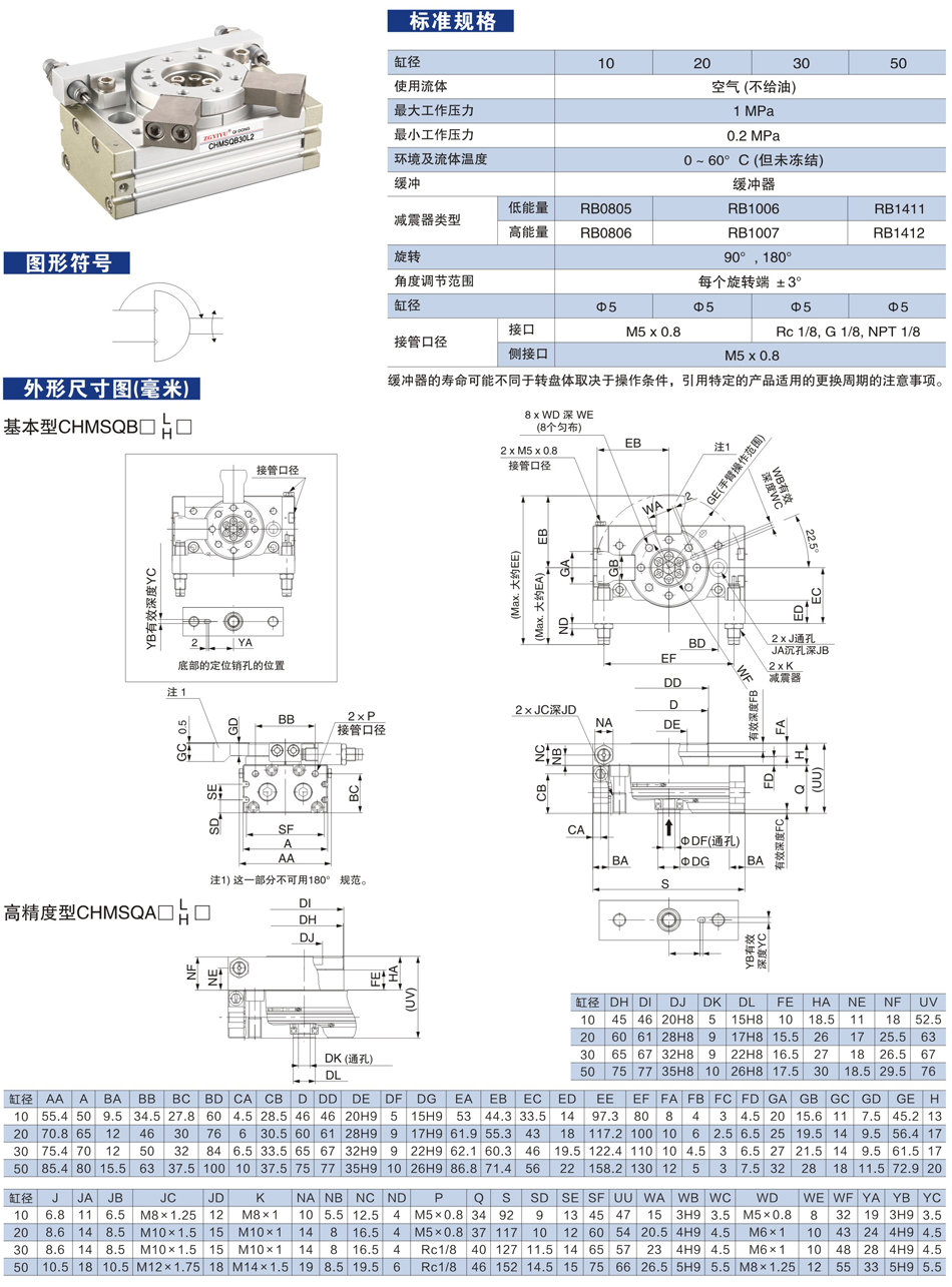 CHMSQ系列(Φ10-Φ50) 高精度型齒輪齒條式旋轉(zhuǎn)擺動氣缸