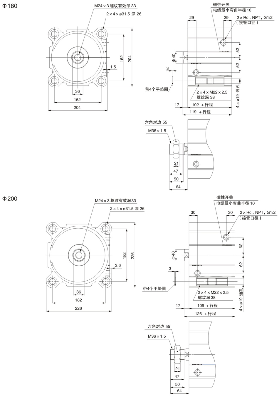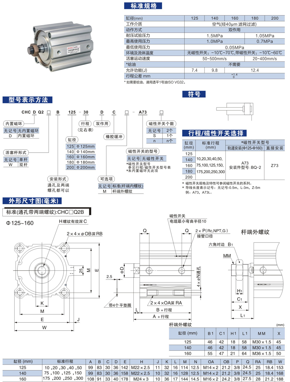 CHCQ2系列(Φ125-Φ200) 薄型氣缸(大缸徑)